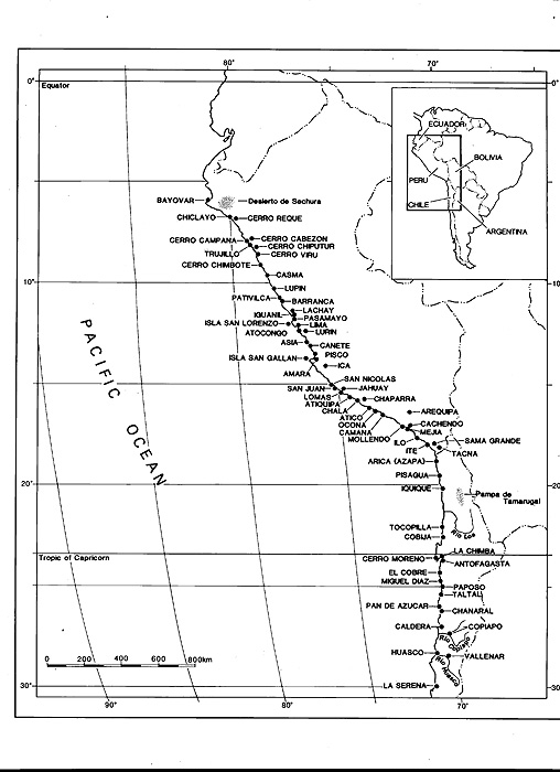 ØEl desierto costero del Peru se localiza entre el océano Pacífico (oeste), la cordillera de los Andes (este), Piura (norte) y Chile (sur).